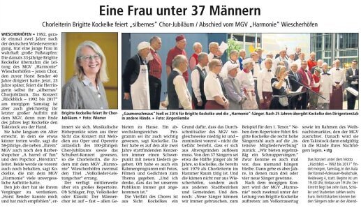 Das Konzert „Rückblick – 1992 bis 2017“ am morgigen Samstag ist aber auch gleichzeitig ihr letzter großer Auftritt mit dem MGV, denn zum Ende des Jahres legt Kockelke den Taktstock aus der Hand. Sie habe langsam ein Alter erreicht, in dem sie etwas kürzer treten wolle, sagt die 58-Jährige, die neben „ihrem“ MGV auch noch den Barbershopchor „A barrel of fun“ und den Popchor „Hörstürz“ leitet. Beide werde sie vorerst auch noch behalten, sagt Kockelke, die mit dem MGV „Harmonie“ viele unvergessliche Auftritte hatte.