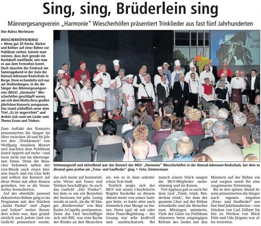 Männergesangverein „Harmonie“ Wiescherhöfen präsentiert Trinklieder aus fast fünf Jahrhunderten. Wenn gut 30 Köche, Bäcker und Kellner auf einer Bühne vor Publikum stehen, könnte man meinen, dass dort gerade ein Kochduell stattfände, wie man es aus dem Fernsehen kennt.